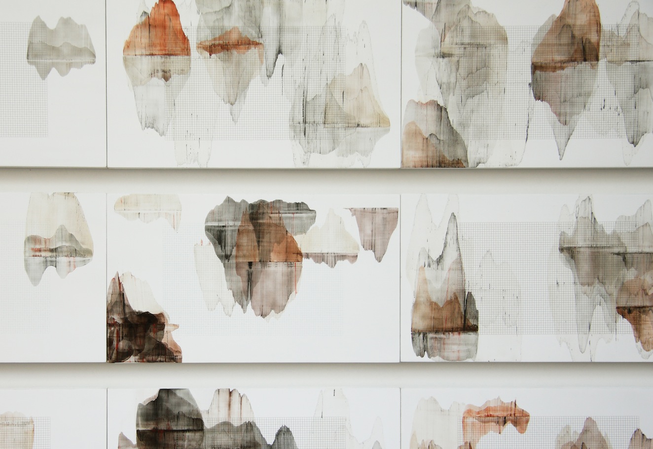 Here are stains of substances carefully modulated on pure white surfaces for their revelatory indications, washes by recipe allowing a latitude of variation along one axis while retaining numerical limits and control of the other elements. A graph-like evidence emerges, layers of a wordless sign, measurements of specific reactions, or are they calculations of specified emotions. Fragments of a landscape or a specimen each embedded into the surface, each panel a recent fossil of a Now moment, perhaps yours…Now.